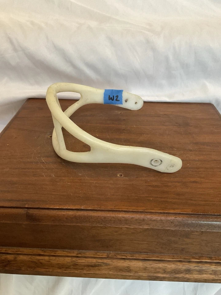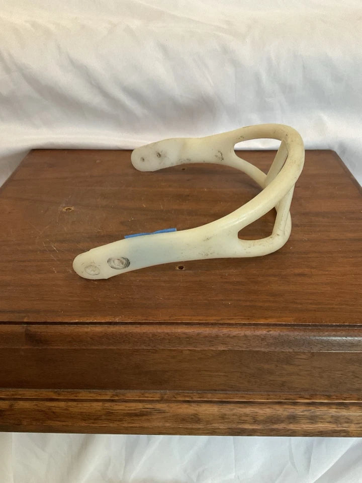 Used 1960's Vintage ORIGINAL 2-Bar Facemask. Mask doesn’t have any legible stamping, but is made by Wilson. This is one of the most famous of all Wilson facemasks as used by the Chicago Bears for several seasons. Mask will fit all 1950s-1970s suspension football helmets and shows attractive game use and wear.