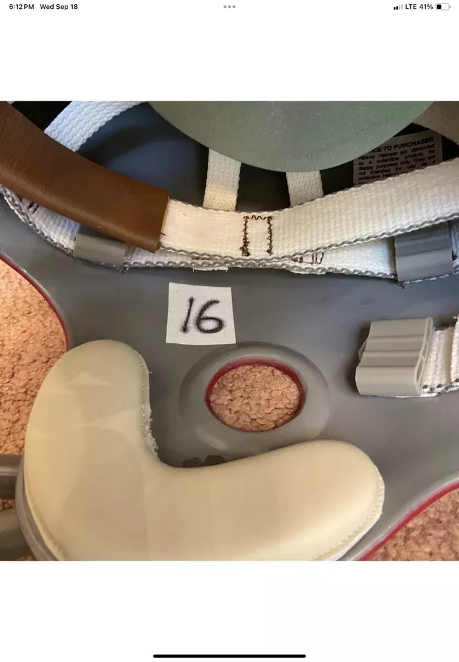 These helmets are recently manufactured Riddell Pro-Line Authentic On Field helmets! The adult size 7 3/8 suspension webbing is identical to the original right down to the same brown thread that was used to stitch it together. Thin mil decals exactly as the originals, real leather jaw pads, gray toned strap and identical front style labeling makes this helmet indistinguishable from the original.