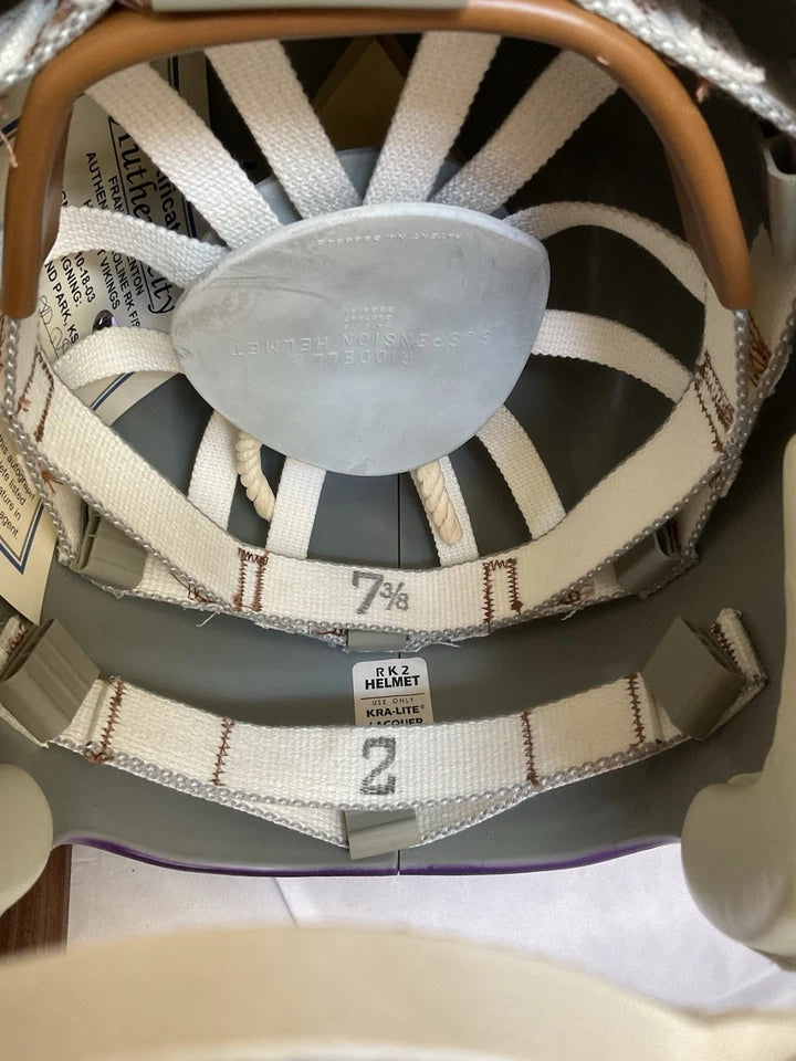 A classic step back in time! The classic shape of the Riddell RK's slightly flared shell and handsome metal rivets are complemented by the attachment of an original Riddell two bar facemask. These helmets are Riddell Pro-Line Authentic On Field helmets! The adult size 7 3/8 suspension webbing is identical to the original right down to the same brown thread that was used to stitch it together. Thin mil decals exactly as the originals, real leather jaw pads, gray toned strap and identical front style labeling makes this helmet indistinguishable from the original. They are painted gray inside just as the Riddell vintage originals from the 1960's, and also have the "KRA-LITE" and "RIDDell" trademarks branded into the rear of the helmet, unlike some other helmets you may find on the market these days which have neither. Do not settle for a substitute. Demand the real thing!