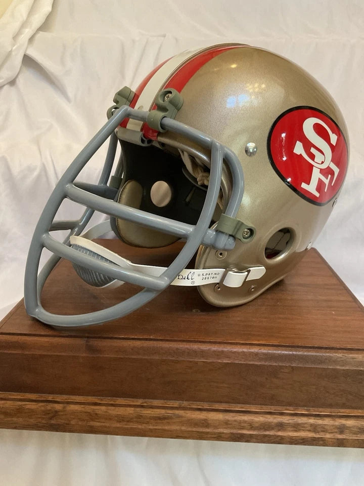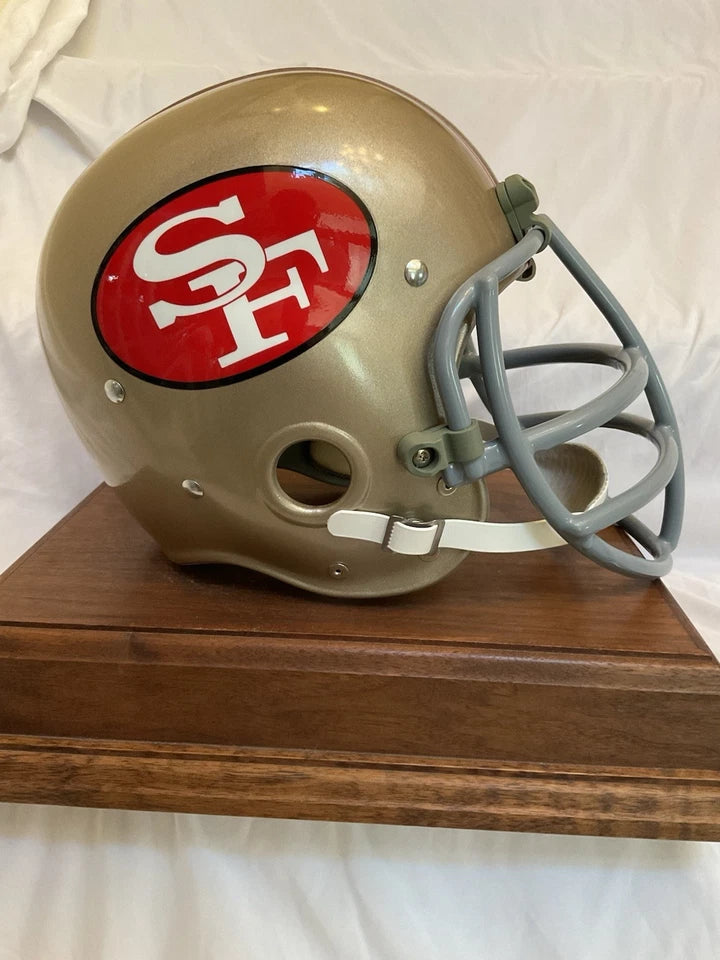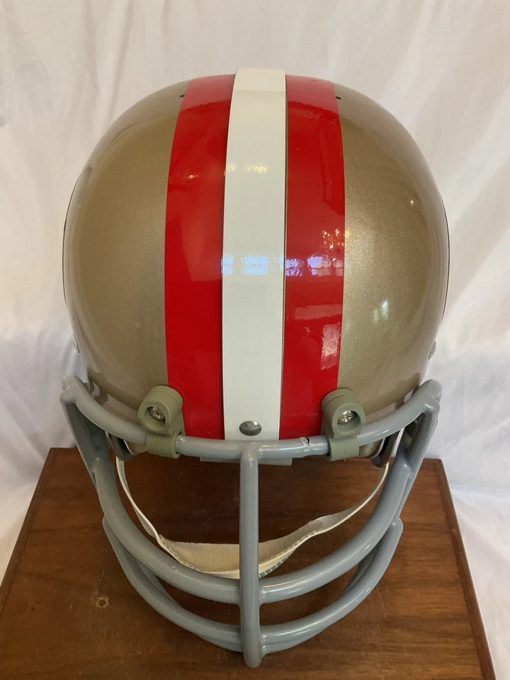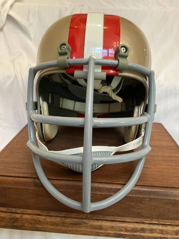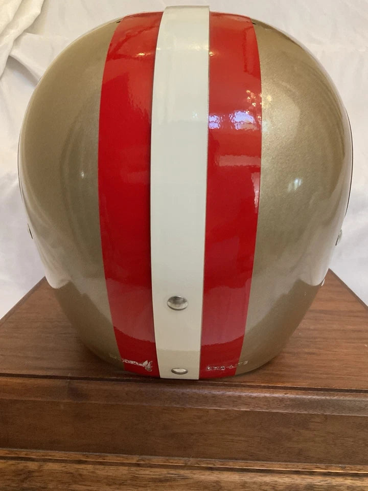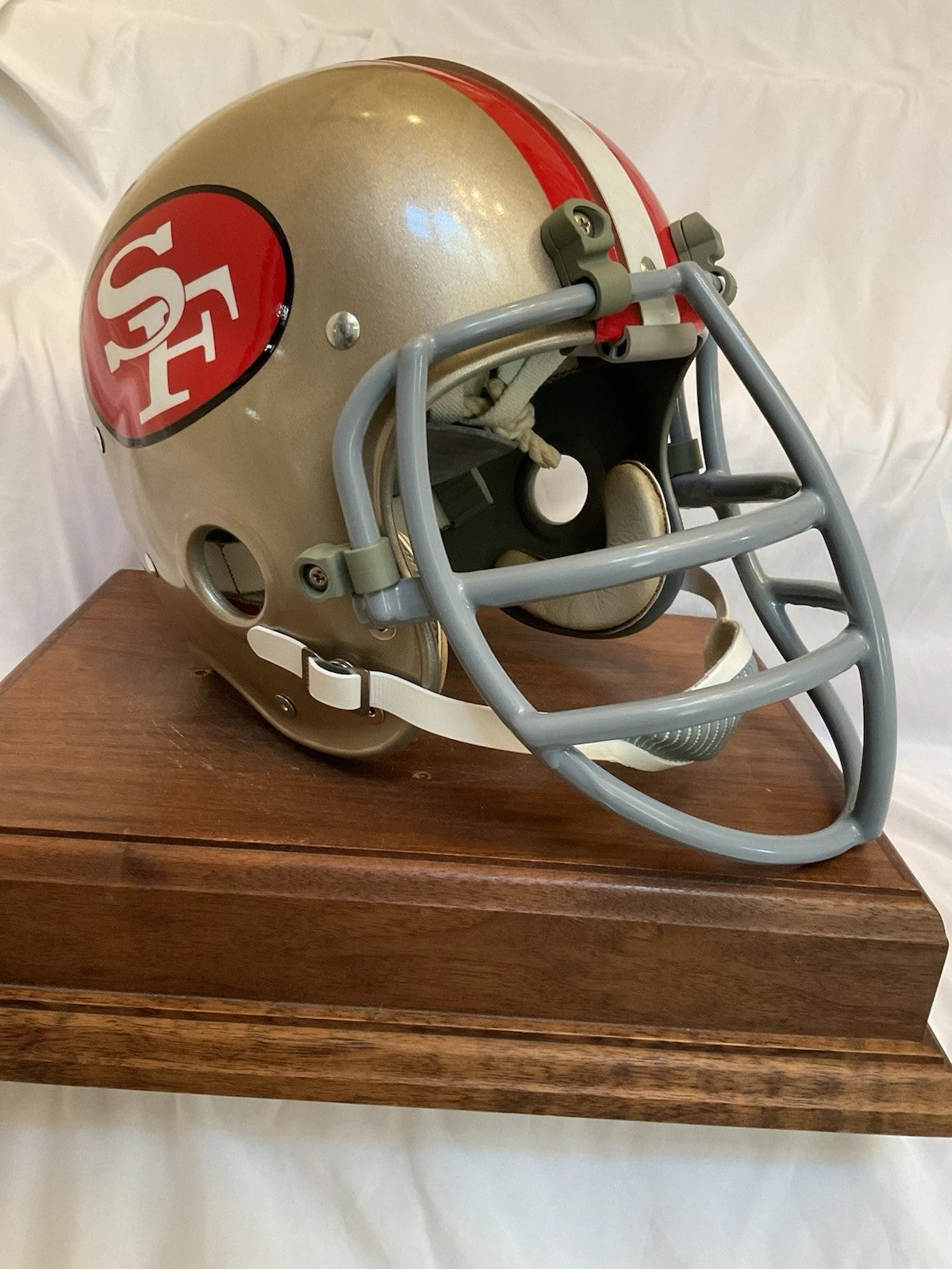 Riddell Classic RK2 Kra-Lite helmet as many 49ers All-the great players wore in the 1960s. This helmet includes authentic leather jaw pads and two tone, gray and white soft cup chin strap. To round out the package, the helmet also includes the 1967 Schutt style NJOP facemask as shown. This helmet displays beautifully!