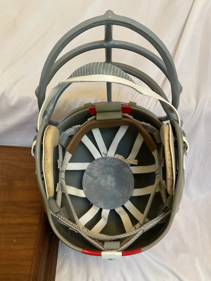 A classic step back in time! The classic shape of the Riddell RK's slightly flared shell and handsome metal rivets are complemented by the attachment of an original Riddell two bar facemask. These helmets are recently manufactured Riddell Pro-Line Authentic On Field helmets! The adult size 7 3/8 suspension webbing is identical to the original right down to the same brown thread that was used to stitch it together. Thin mil decals exactly as the originals, real leather jaw pads, gray toned strap and identical front style labeling makes this helmet indistinguishable from the original. They are painted gray inside just as the Riddell vintage originals from the 1960's, and also have the "KRA-LITE" and "RIDDell" trademarks branded into the rear of the helmet, unlike some other helmets you may find on the market these days which have neither. Do not settle for a substitute. Demand the real thing!