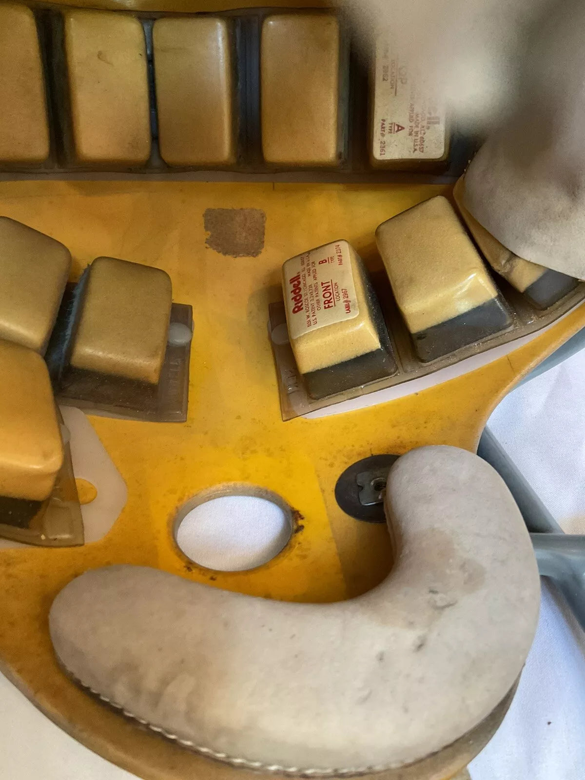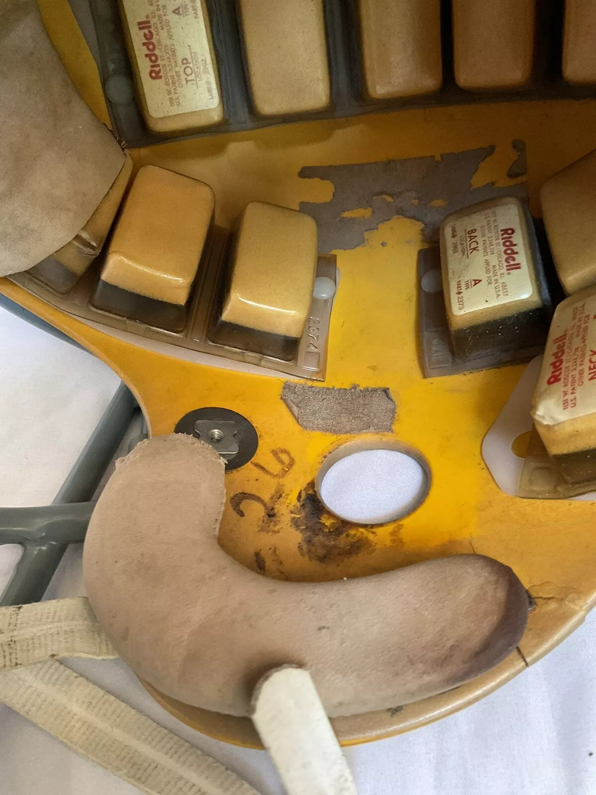 While we cannot make out any identifying markings to determine which players might have worn this helmet, there is a piece of athletic tape present in the helmet which would have had the information but the writing has faded.