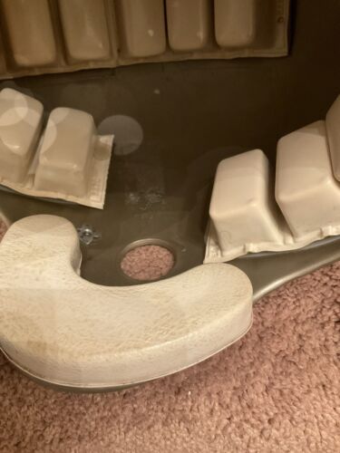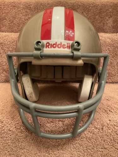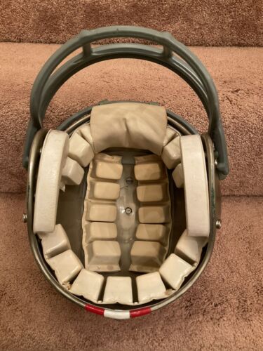 Vintage helmet has all that you see including authentic padding, authentic team issued decals as used in the late 1970s-1980s, Rare Schutt double wire Extra Large Green Dot OPO facemask as shown in photos, as well as “thick” size jaw pads, Riddell wildcat sweatband, and authentic striping.