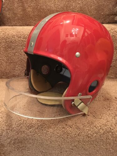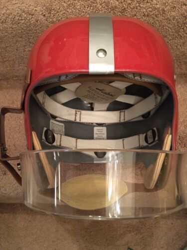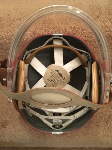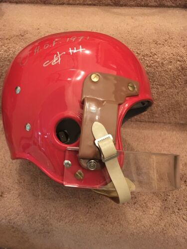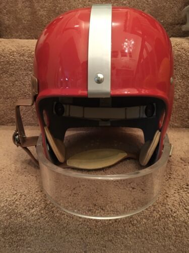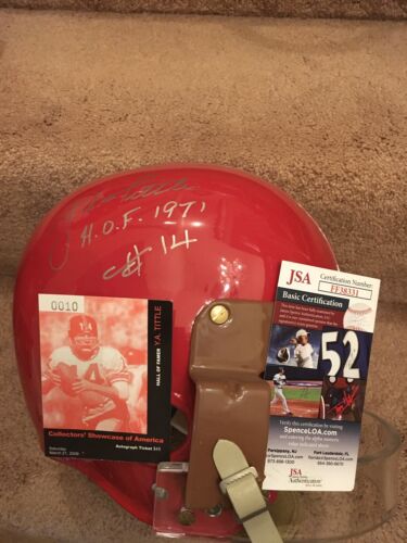 RT suspension Football Helmet, painted red with silver center stripe of the San Francisco 49ers, and autographed in person by All-Time great and Hall of Fame quarterback Y.A. Tittle. This beautiful helmet was built with lucite facemask and custom brown metal “handle” mounted just as 49ers equipment managers added to Mr. Tittle’s helmet in 1954 after an injury to Mr. Tittle necessitated this interesting innovative protection. See last photo. PLEASE NOTE: WE ARE NOT CLAIMING THIS HELMET WAS ISSUED OR USED BY MR. Tittle OR THE 49ers. Comes with COA from JSA as shown in photos. Will make a stunning display, and looks like it just came off the field!
